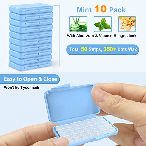 Braces Wax, 10 Pack 50 Precut Wax Strips 350+ Dots, Blue Cases. Includes Storage Box & 2 Applicator Tools, Food-Grade Premium Dental Wax for Braces & Aligners- Stick Better (Mint+Aloe Vera +Vitamin E)